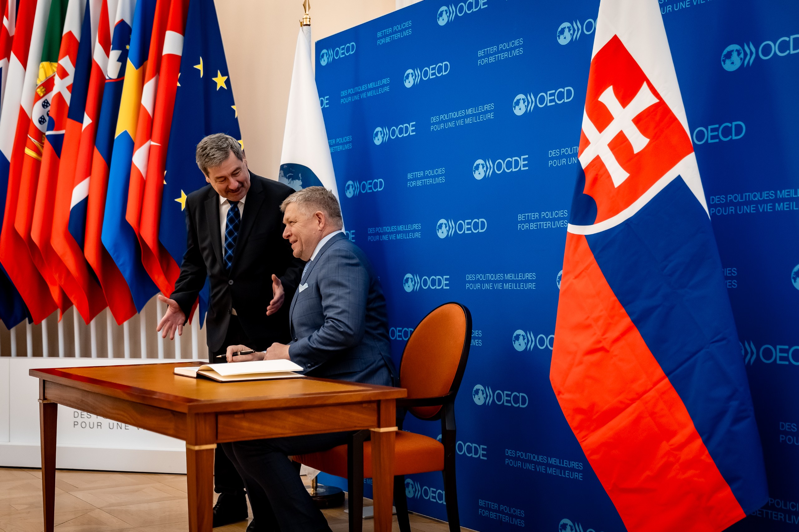 Dnes predseda vlády navštívil sídlo Organizácie pre hospodársku spoluprácu a rozvoj v Paríži. Ide o elitnú ekonomickú inštitúciu, ktorá má len 38 členov a Slovenská republika do nej vstúpila už pred 25 rokmi. Spolu s ministrom financií Ladislavom Kamenickým navrhli predstaviteľom OECD prehĺbenú spoluprácu pri hľadaní prorastových opatrení pre Slovensko. „Dohodli sme sa, že spoločne pripravíme pre Slovensko dôveryhodný plán podpory hospodárskeho rastu vychádzajúci z domácich zdrojov, že spoločne stanovíme stratégiu, ako sa má Slovensko v krátkom časovom úseku správať v novej kvalite geopolitickej situácie a ako má využiť výhody získané suverénnou slovenskou zahraničnou politikou orientovanou na všetky štyri strany pri získavaní zahraničných investícií a ako tento krátkodobý plán zaradiť do pripravovanej Vízie a stratégie rozvoja Slovenska do roku 2040, na ktorej vláda začala intenzívne pracovať,“ uviedol po prílete do Bratislavy premiér Robert Fico a dodal, že odmieta bezhlavo konsolidovať a škrtať len preto, aby sme mali pekné čísla.